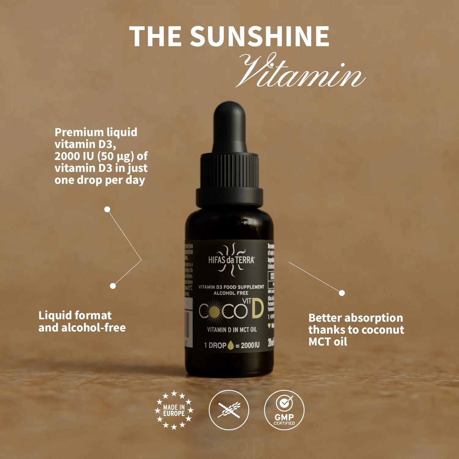 Vitamina D3 líquida altamente concentrada y biodisponible en aceite MCT, extraído del aceite de coco. Tan solo 1 gota (2000 UI)/día acompañando una de tus comidas principales. Libre de alcohol.