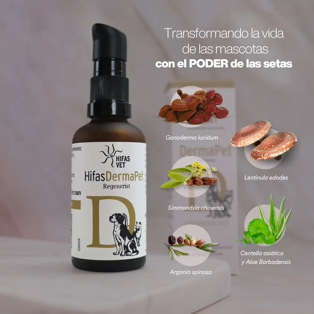 Hifas Derma Pet Favorece la protección y el cuidado de la piel de las mascotas gracias a la acción directa de sus moléculas naturales. Mantiene la piel suave e hidratada de forma natural, aportando brillo y vitalidad en la piel y el pelo de perros y gatos.
