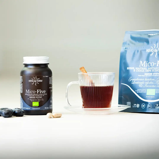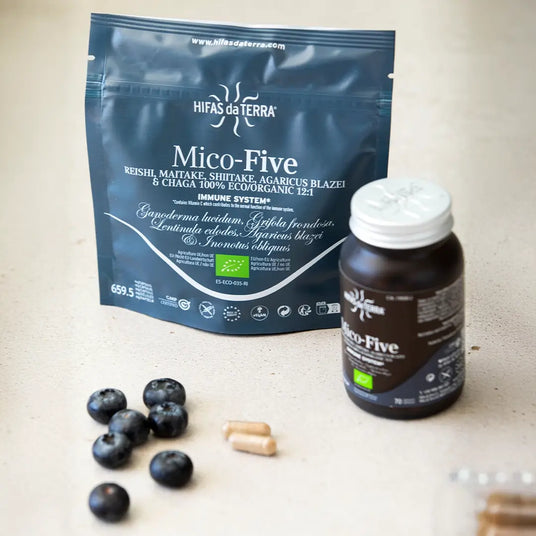 Mico-Five es una combinación de Reishi (Ganoderma lucidum), Shiitake (Lentinula edodes), Maitake (Grifola frondosa), Champiñón del Sol (Agaricus blazei) y Chaga (Inonotus obliquus), todos de cultivo ecológico. Mico-Five no se elabora con micelio, solo contiene la parte más rica en sustancias bioactivas de cada especie. Esta fórmula destaca por la potencia de la sinergia, que es más que la suma de las partes. En este caso aporta una gran cantidad y variedad de sustancias bioactivas, especialmente beta-glucanos, seleccionadas por su actividad sobre el sistema inmune. Descubre la calidad superior combinada con la transparencia y la experiencia de Hifas da Terra.
