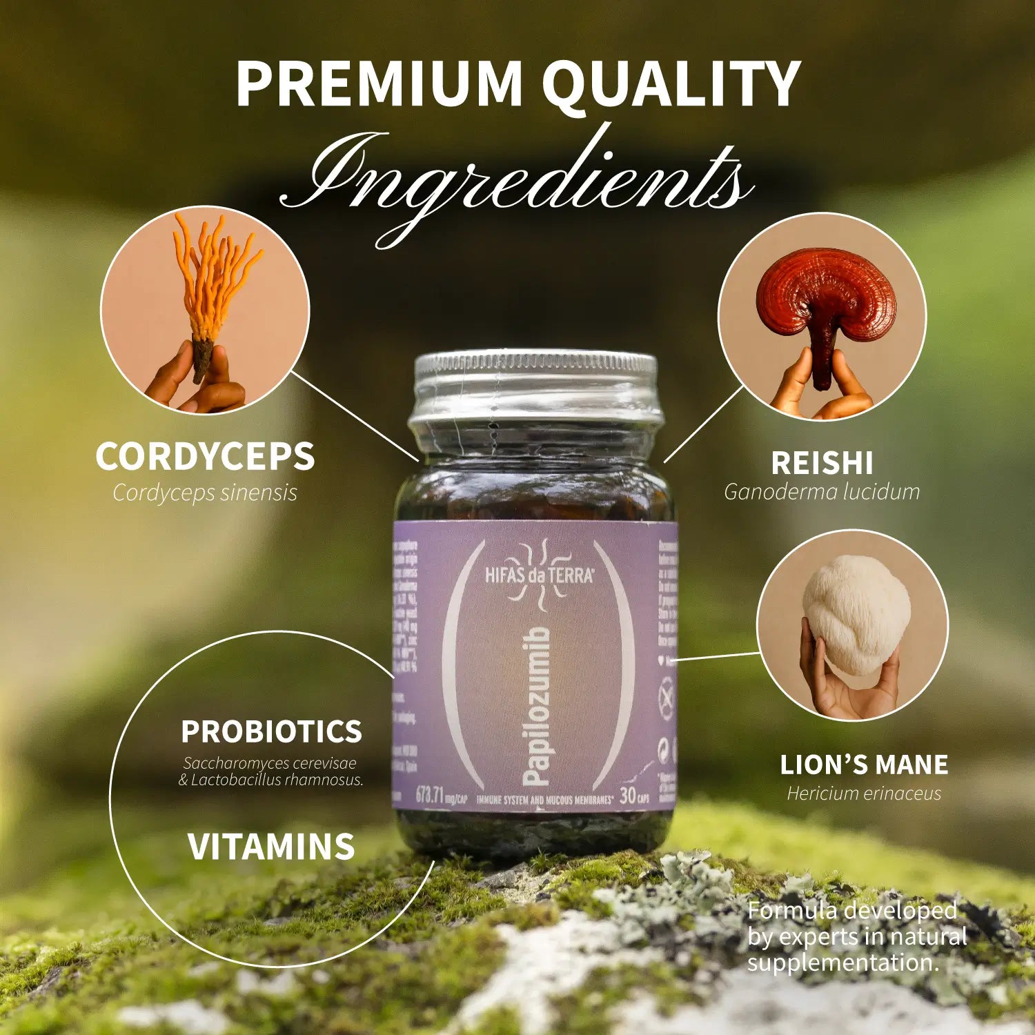 Papilozumib is a natural supplement in capsule form that acts on the immune system, the mucous membranes that protect us, and the microbiota. It includes adaptogenic fungi used in Eastern medicine with prebiotic content (Reishi, Lion's Mane, and Cordyceps). Among these, Reishi stands out, a mushroom similar to Coriolus versicolor, traditionally used as an adaptogen and stimulator of the body's natural defences*.